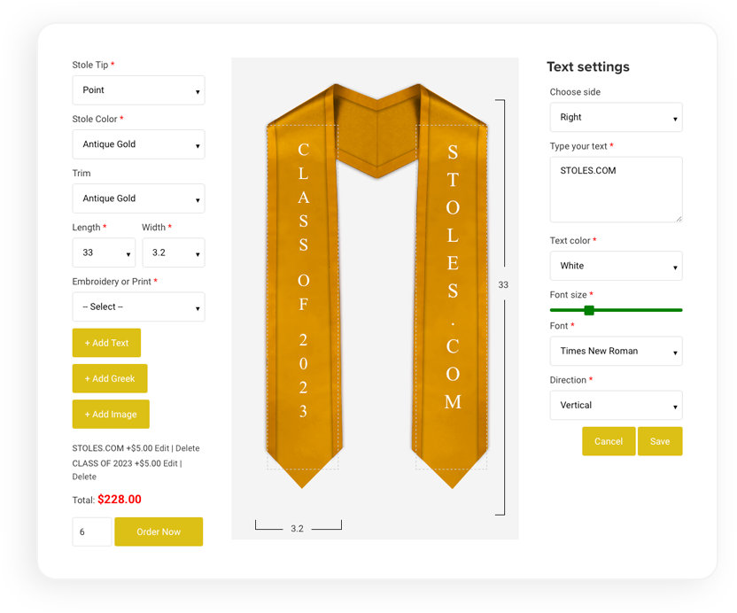 At Stoles.ca we are committed to manufacturing the highest quality custom graduation stoles and sashes. All of our religious and graduation stoles are produced out of top of the line bridal satin and professionally embroidered or printed to make sure your stole look meticulous. We offer the largest online selection of in-stock and custom stoles and sashes for either your graduation or religious event. You'll find the guaranteed cheapest prices on everything from graduation stoles and greek sashes to choir stoles and clergy stoles. We are proud to offer safe and secure ordering as well as free and flexible shipping options. Stoles.com is the nation's number #1 choice for graduation sashes and stoles.
