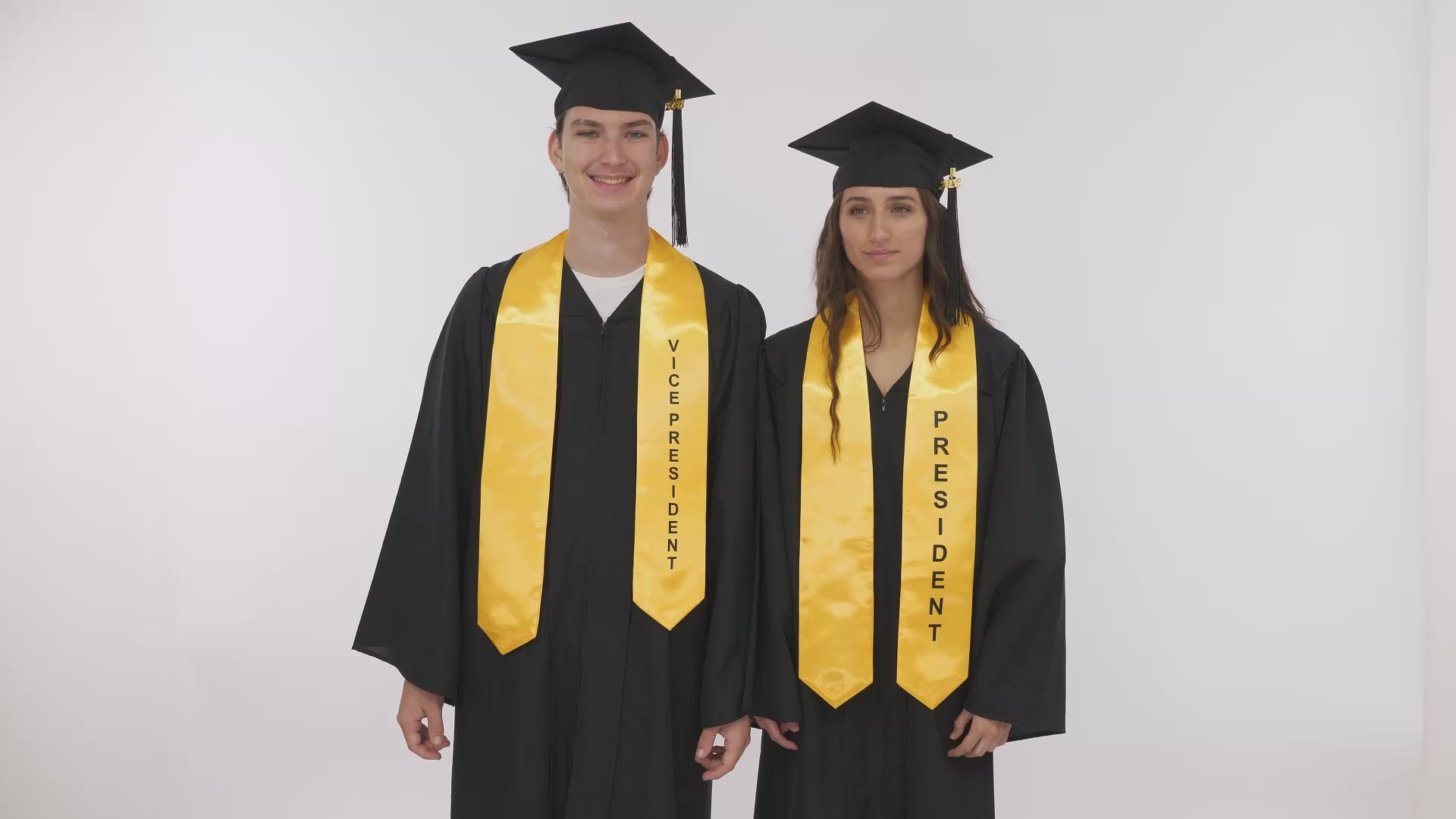 Our VICE PRESIDENT stole which is beautifully handcrafter and has a the word VICE PRESIDENT screen printed in black on gold satin stole. Class leadership stoles are designed to bring visual recognition to class officer graduates and usually worn with a graduation cap and gown.